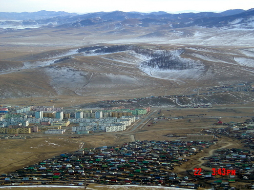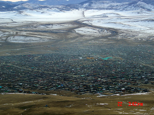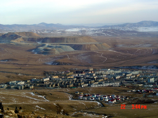 這三張照片應該從左至右排列,技術不足,只好請大家自己在腦海裡連接。真是抱歉。無論如何,可以看出最左邊上方平頂圓錐體的銅礦山,中間部分是新城現代化的公寓大樓,最右方是城郊的木房蒙古包區。壁壘分明地櫬著遠方遼闊雪白的山陵。