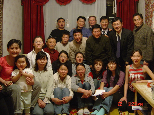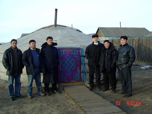 巴策爾弟兄,後排左起第二位,穿藍白細條紋襯衫。典型的蒙古大漢。前排左是他的妻子和寶貝女兒。巴策爾—Batzul,蒙古文意思是「火苗」。蒙古國旗上就有一個「巴策爾」(火苗)。
