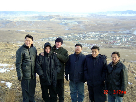 圖二:弟兄們在山上,以鄂爾登特為背景合影。那天氣溫是攝氏零下十七度,大家卻靈裡火熱地向天地宣告「在基督裡,我們是一」。這裡有蒙古人,俄羅斯人(左三),韓國人(右二),還有台灣來的華人(就是我,正拿著相機照相)。