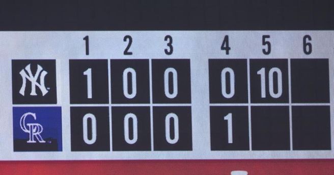 第5局洋基連續5人上壘,兩支犧牲打之後又是連續5人上壘,10個人跑回來得分。期間沒有全壘打,單純是接連不斷的波狀攻擊,自然而然就把雙方的比分從1比1一路灌到11比1。