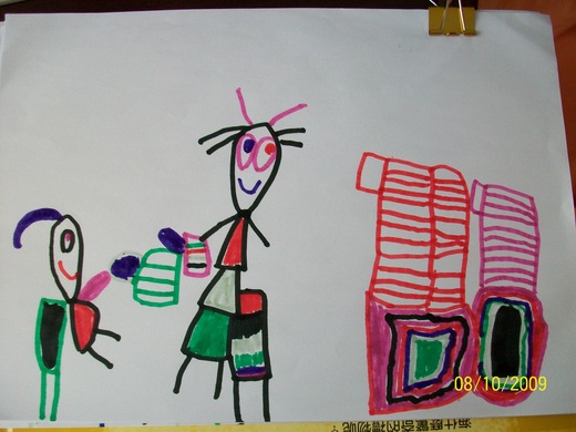 女兒說:「藍色頭髮那個是我,而頭髮豎起來的則是媽媽(因為我在家裡都沒有梳頭髮)。媽媽正在幫我倒水,而且倒了很多。旁邊紅色與粉紅色的都是熱水瓶,紅色的是媽媽的,粉紅色的是我的。」