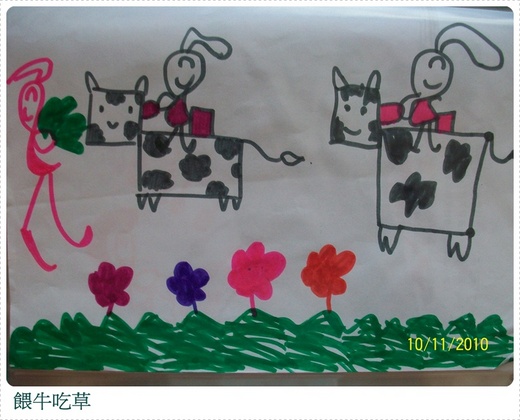 從大山牧場回到家裡當天,芃芃就吵著叫老公要畫牛給她看,但老公畫的牛真的不好看,我就畫了一頭可愛小牛給芃芃看(左邊那頭牛就是我畫的啦),芃芃也仿畫了一頭牛(右邊那頭牛就是芃芃畫的),芃芃再畫兩個人各自坐在牛背上。