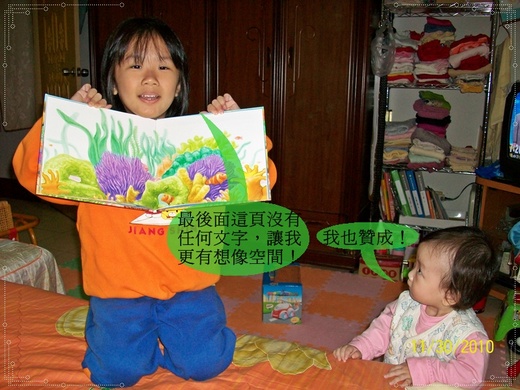 芃芃點點頭,「嗯!我最喜歡最後一頁,可以隨便我想、隨便我說。」瑋瑋(小女兒)也在一旁發出「嗯」的聲音,好似贊同的附和著。