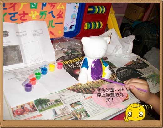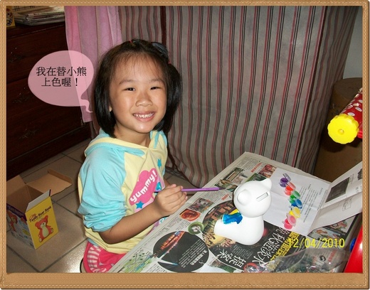 回到家,芃芃就吵著要替小熊上色,幫芃芃撲好報紙,東西都備妥後,芃芃卻說:「媽媽,妳出去啦!不要看我畫。等我畫完再叫妳,好嗎?」我說:「至少讓我拍幾張照片嘛!拍完我就閃人嘿!」芃芃點頭答應後,我就趕緊拍個幾張。