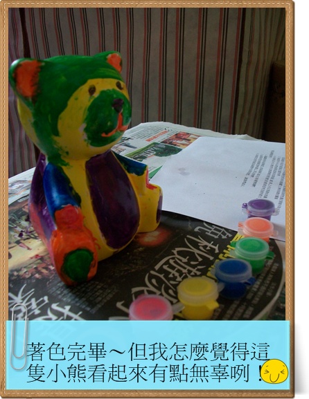 當我看到芃芃亮出作品時…..,怎麼看都覺得這隻小熊臉部看起來好像有點憂愁捏!不是很開心喔!不過芃芃使用色調依然偏向大膽與繽紛,是蠻有特色的作品,很藝術的感覺喔(自己的孩子嘛!當然要多稱讚幾句囉)!