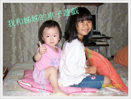 大(芃芃)小(瑋瑋)女兒在玩遊戲,芃芃坐在枕頭上假裝是在騎車,要瑋瑋上車抱著她。芃芃假裝載瑋瑋去阿嬤家、逛夜市、買菜…等。一下上車又下車的,好忙碌啊!