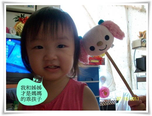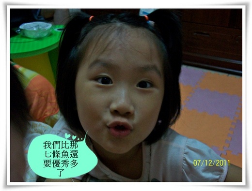 大女兒有時也會在旁邊吵,「我要幫忙夾水草起來」、「我要幫忙換水」、「我要….」。哈哈!我說:「妳幫忙照顧好妹妹就好,不要讓妹妹跑去摸電風扇」。大女兒大部分的時間確實將妹妹照顧得不錯!確實是不錯的小幫手啦!
