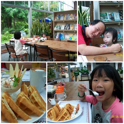 在等餐點的時候,小女兒很躁動。也因為小女兒的躁動,我牽著她到處走走的同時,才發現原來餐廳裡還有一個園藝廳,裡頭都是蘭花,好美麗啊!還有小小的香菇椅子、桌子喔(就一組而已喔!當時有人坐著,我們就不好意思拍照囉)!