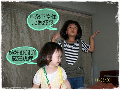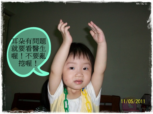 還好上幼稚園有耳朵聽音檢查,結果老師說:「芃芃好像聽不到,」我們才上大醫院求診,大醫院醫生初步檢查說:「應該是耳屎塞住了,」而給予點耳朵的藥水,每天按時點,再去檢查、並挖出軟化後的耳屎,重新檢測了耳朵,總算是沒有問題,順利過關。