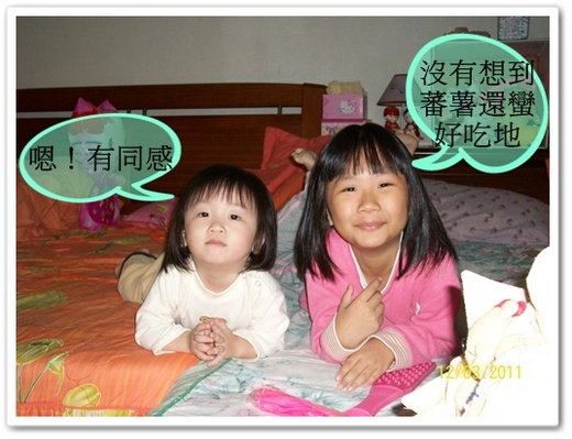 意外的發現芃芃和瑋瑋還挺喜歡吃烤蕃薯,卻出乎我意料之外的,她們都不愛吃蜜蕃薯。