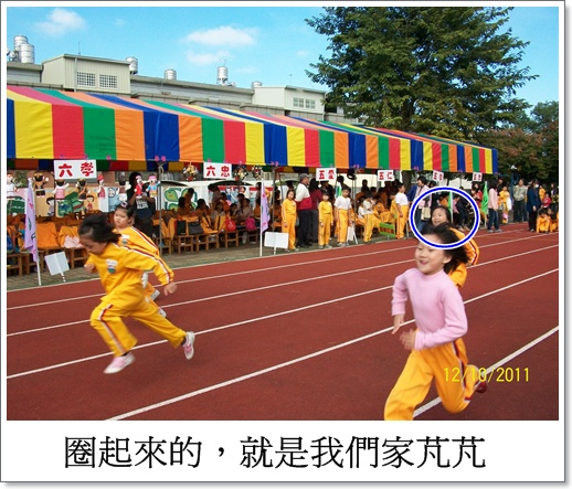 跑最後一名也沒有什麼啊!我說:「盡力跑完就好啦!」其實啊!從芃芃的步伐看來,並沒有認真跑,感覺有點像在散步,呵!
