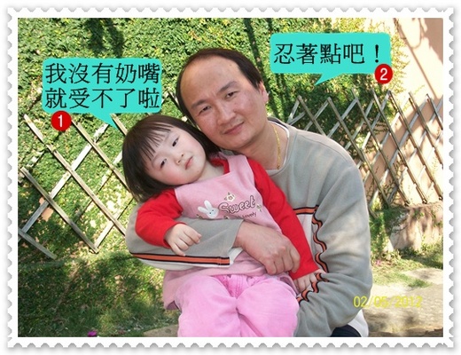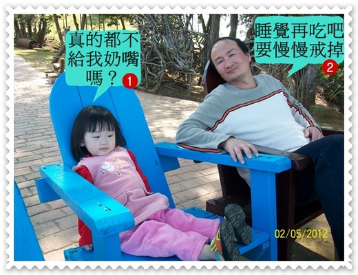 小女兒心情好的時候,看到奶嘴還會自己說:「我長大了,不用吃奶嘴了啦!」但,過沒有多久又自己偷偷的去拿奶嘴來吃。