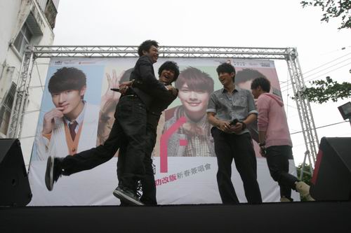 四個帥哥站在舞台上隨便擺個post就引來台下女粉絲尖叫,噪音分貝只能用「吵死人啦」來形容。沒想到四人唱完歌不知道是太無聊還是想搞笑,居然在台上輪留玩起男男熊抱,這下可好了,被狗仔拍個正著,看來可以交差了,照片就留給最八卦的木瓜霞處理,還心想這標題可能會來個「飛輪海大搞男男熊抱」之類的。