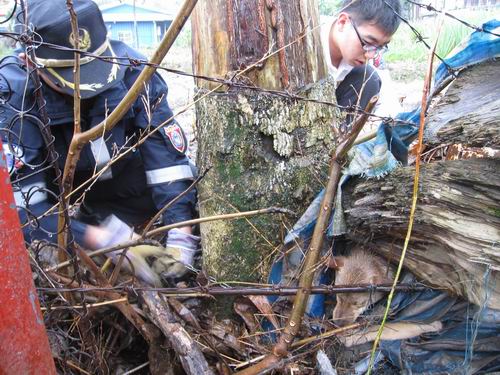 台北富邦銀行業務經理黃玉炎指出,昨到秀林鄉水源村拜訪朋友,意外發現有隻小黃狗困在草叢樹枝下動彈不得,打電話給消防局協助救狗,消防隊員趕至後發現狗的左前肢被捕獸夾困住,救援過程中,小狗不停掙扎竟扯斷了自己的兩根腳趾,讓人看了很心疼。