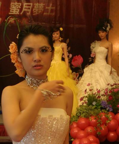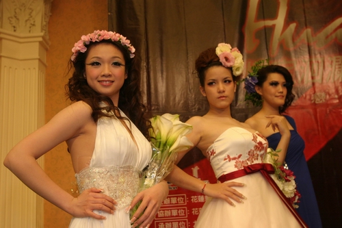 遠雄悅來大飯店昨邀請知名婚紗店在飯店進行婚紗走秀,並為即將在四月十五日舉行的集團結婚暖身,模特兒身穿時尚婚紗走秀,展現窈窕身材,但最引人注目的是模特兒眼部有如花瓣的假睫毛造型,主辦單位表示,今年的婚紗搭配花蓮美景花海拍攝入境,特別以花卉主題替新娘做造型,要讓新娘如花一般美麗。