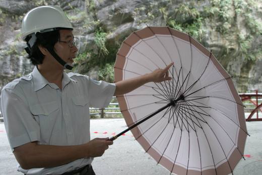 這罕見新聞才剛發生不久,沒想到落石不長眼,不久前又砸傷了一名美籍幼童及日本客,這回政府又得想辦法來應付落石了。這一次,政府可是找來專家學者測試,最後選擇考慮用這把「行動防護傘」來擋凌空落石耶。