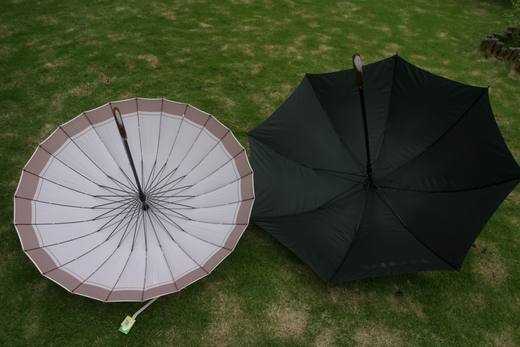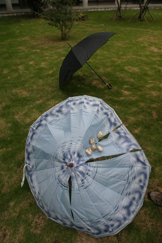 這一天,我親自拿了石頭用力往這把雨傘丟,只見雨傘骨架被石頭打凹了,石頭彈開了,看似有阻隔落石砸頭的危機,但落石可不是每一顆都是圓的,天空墜落的尖頭落石還是有可能避開這把有二十四節雨傘骨架的縫隙,刺穿傘布,然後命中頭部的。不知道台灣有沒有人可以找出阻擋凌空落石的好方法?動動腦發明一下吧!
