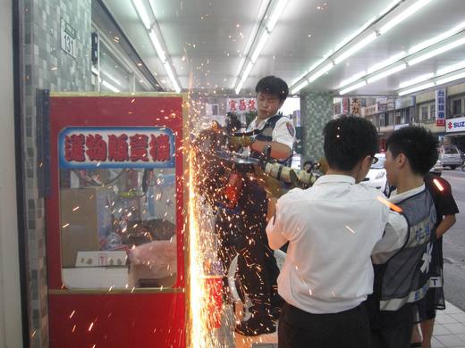 超商女店員見貓咪呼吸急促有窒息危險,趕緊拿電風扇吹夾娃娃機洞口並報警處理,警消隨後趕至動用破壞器材,持電鋸費了九牛二虎之力,剪斷夾娃娃機兩個鐵鎖,拆開玻璃窗,花了半小時才將受困貓咪救出,主人才興奮地抱著貓說「阿喵你紅了!」