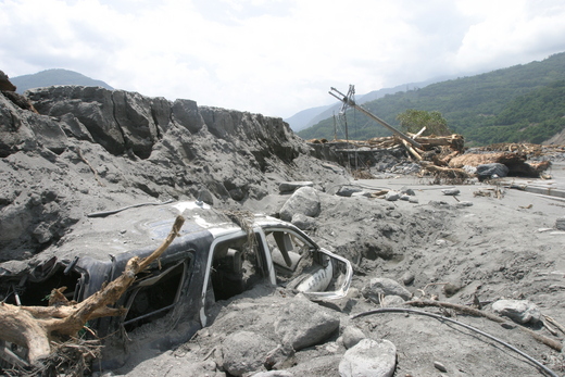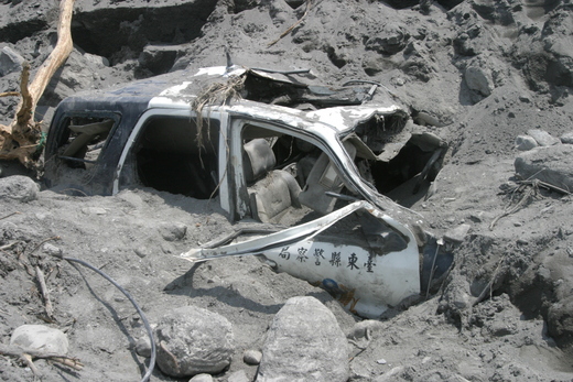 一名參與搜救的警員指著遠方說,溪畔的那三根電桿下方,遭土石掩埋的就是同僚的警車,只見車底,車內一個人都沒有,當天有人報案,說曾看見兩名員警抱著電線桿,在溪床邊揮手求救,但溪水越來越湍急,後來就不見兩名員警的蹤影。