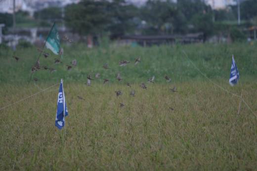 於是用放沖天炮的方式趕鳥,成群的麻雀聽到「碰!」的聲響,隨即嚇得四處亂竄,阿嬤無奈地說這方法是有一點嚇阻作用,但一天守著稻田至少要放上五百支以上沖天炮,很累人的。而這個人鳥大戰,一直要延續到稻米收割才會結束。
