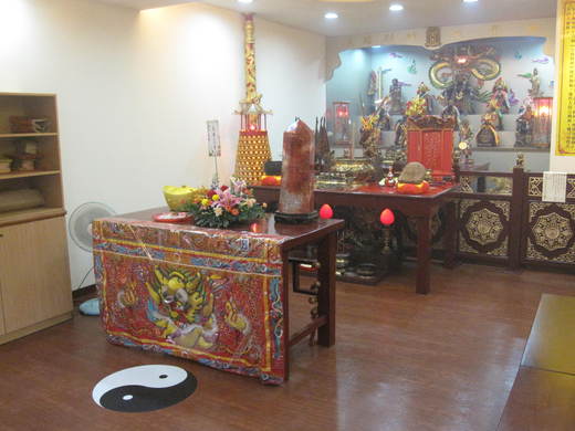 他要家屬把男孩壓制在地板上的太極圖騰上,接著他到廟宇前天花板上的另一個太極圖騰吸氣,還要我幫忙放佛經音樂,但因神明前的門我打不開,後來是一名師父進入放音樂。