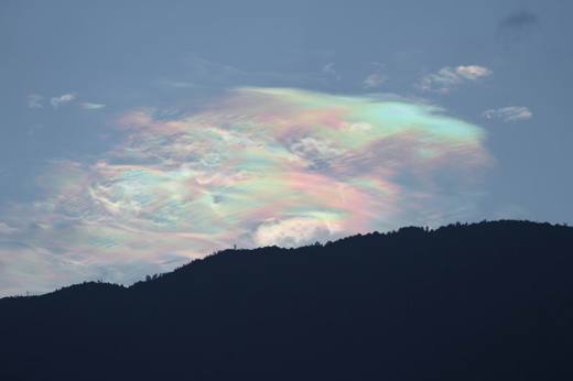 花蓮縣壽豐鄉靠近中央山脈的天邊昨天傍晚五時許出現彩虹雲,約持續一個小時才消失,花蓮氣象站主任陳世嵐說,台中地區昨有午後陣雨,豐沛的水氣加上太陽光線的折射,才出現這種罕見自然現象,在美國氣象專家研究這叫做「