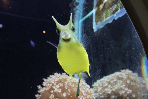 花蓮海洋公園水族館內暗藏一隻長相奇特的牛角箱魨,海洋公園海洋部副理林勝吉說,牛角箱魨因頭部長了兩根很像「牛角」的觸角而得名,常吸引小朋友好奇圍觀,牛角有兩個突出的大眼睛,加上一張小嘴巴,乍看正面頭部,有如卡通皮卡丘也像「吉娃娃狗」的臉「超級可愛!」