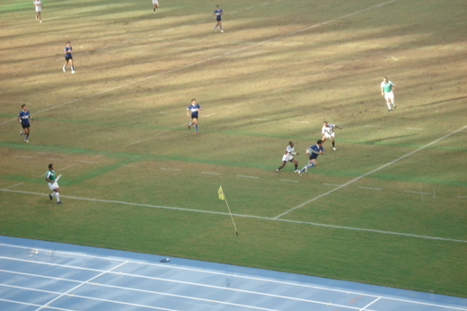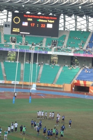 澎湃熱情的音樂又響起,我方穿著藍衣與穿著白衣的美隊,列成二隊精神亦亦小跑步進場,發球,我方先發制人搶得頭球,還不及反應,加油、尖叫、嘶吼、吶喊的觀眾,群情激昂,我方達陣先進5分,不一會,美方反擊「達陣」進5分、在激烈的擒抱、拉扯、鬥牛、撲球過程,我方再攻下一城,觀眾忘情的拍手、狂喊讓我感動激情不已,中場鈴聲響起,鬆口氣、喝口水,緊張、緊張、還是緊張,下半場,看著螢幕計時器7分開始,加油聲、鼓掌聲不斷,我方再進一球,當時觀眾陷入瘋狂喊叫,又踢進H門一球再加2分,這球7分,首開17:5分數拉開,稍安心,看著秒數前進,剩1分32秒被搶「達陣」,此際美方速度加快,仗著優勢體型,我方奮力撲向對方扯住衣服仍擋不住優勢蠻力,整個情勢緊張,眼見秒數越少,分數也節節逼近,此時加油聲更響亮,地主優勢無限力量,終場2分險勝,禁不住用力的拍著發抖的手掌,2、3千人的觀眾將嘶吼吶喊填滿整場,是感動,只因為戰勝美國。