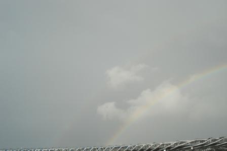 天空下著綿綿細雨,賽事仍進行中,天空底襯著陽光卻下著雨的,有人喊叫:「看!一道彩虹」大家往右邊天空望去,濛濛雨中一道彎彎的七彩虹橋,不幾秒又出現第二道,好彩頭,我心想這是我隊要贏的先兆。