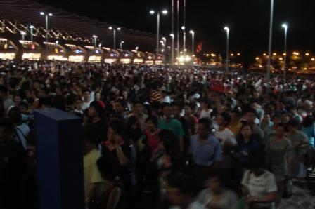 穿過主場外圍已管制的中海路,哇!人山人海,整個主場館外大螢幕前已坐滿人群,從主場館裡傳出陳昇的歌聲,隱約看到館裡的觀眾波浪舞及撼動的聲音傳出;我穿著世運的綠領制服,脖子上掛著KOC的認證,原想應該很容易找到KOC夥伴們的集合處,要隨志工們進場參加閉幕式,但是到達圓形廣場時,只見零星幾個跟我裝扮一樣的人,碰!開幕的煙火在天空中散開,已來不及進場,螢幕裡白色海軍樂隊已奏起音樂,揭開閉幕典禮序幕,只好將就在外場選個對準大螢幕處席地而坐。