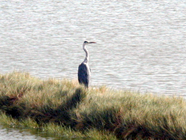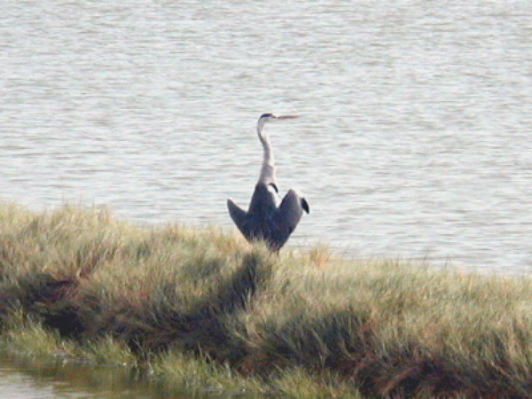 2001年,我在台南市安南區沿海漁塭區看到一隻正在曬太陽的蒼鷺,牠張開雙翅怡然自得曬太陽(上)。後來被牠發現,牠收起了翅膀(下),不到十秒就飛走了。