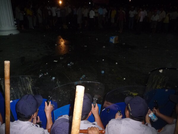 警方說站在椅子上太危險,且妨礙警方部署,覺得這個記者很煩,根本是來亂,立馬抽走鐵椅逼他離開,熊國度心不死,續藏身警力人牆後,將頭手伸至盾牌上方咔咔咔繼續搶拍。眼前白水黑墨臭豬糞如火流星飛來,熊國度眼前一黑,一個黑泥塑膠袋飛來秒中胸部半臉黑花,兩側警察皆掛彩,瞬間臭氣四溢,是一袋參水後的半稀豬糞。唯有參水後的豬屎尿才能在擊中目標後瞬間炸開,臭氣四溢,抗議威力較乾豬糞有效多了。熊國度被迫暫時收兵回石化廠辦公室。