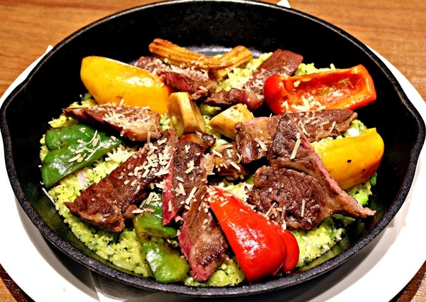 黑胡椒沙朗牛排羅勒好飯 以紅椒 黃椒做點綴 看起來秀色可餐