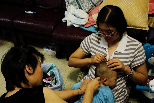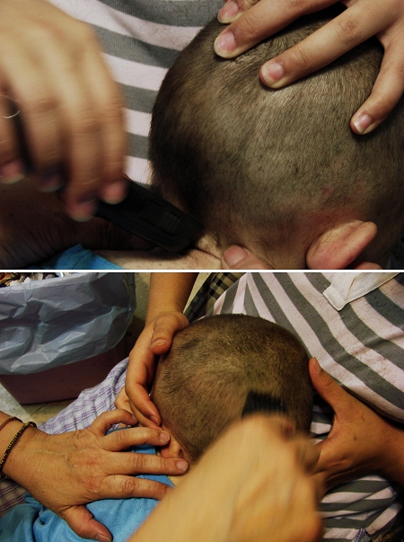 小賢狗仔蛋自從「蛋髮無存」後就沒有再理過頭髮,一來是長得慢;二來天氣冷,不過隨著天氣漸熱,小賢狗仔蛋頭髮屬軟絲遇汗易亂型,這次由阿嬤親自操刀: