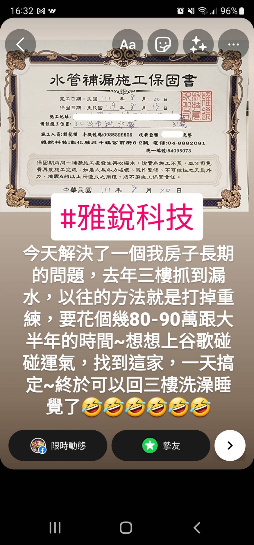 哪天去豐原某別墅補漏,聽著業主訴說有找幾家抓漏工程跟水電抓漏估價,說一定要敲敲打打,前前後後也得花不少錢,聽他說抓補漏的費用將近百萬,而且施工期也長達半年,費時費錢,然後就上網找找,再哪麼多專業管路補漏中看到雅銳科技水管漏水免打牆補漏,心想也不到預估費用的10分之一,而且施工保固期很長,哪就決定給雅銳一個機會了。