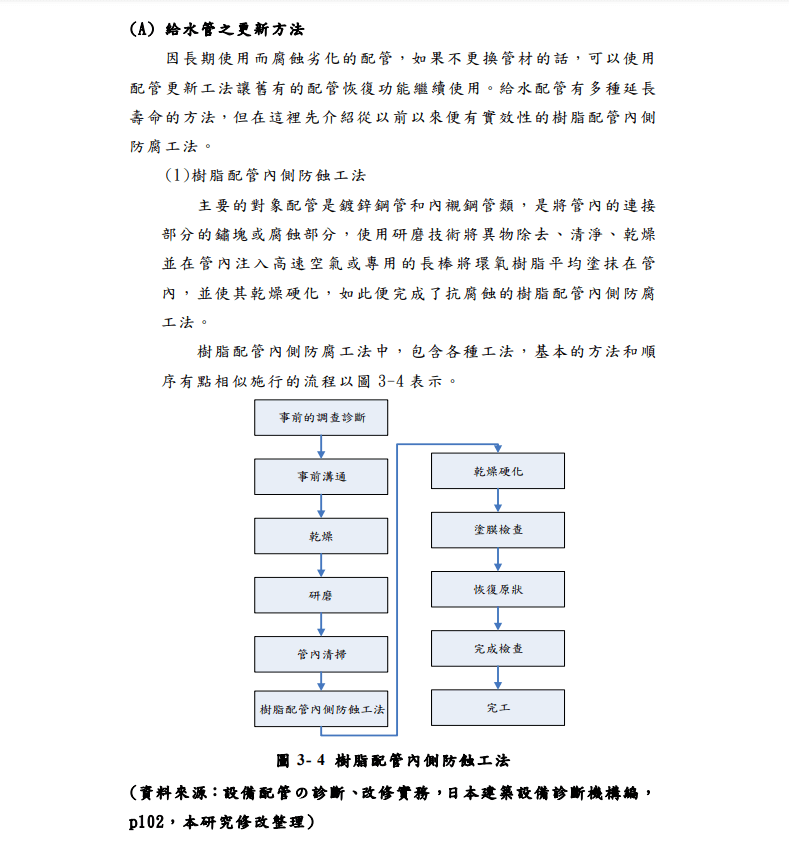 第三章建築物管線檢測修復技術之探討第四節管線修復方法(A)給水管之更新方法,提到日本建築設備配管之診斷、改修實務就是使用管內灌注,當然這是一項很複雜的工程