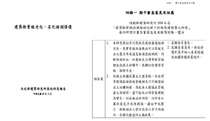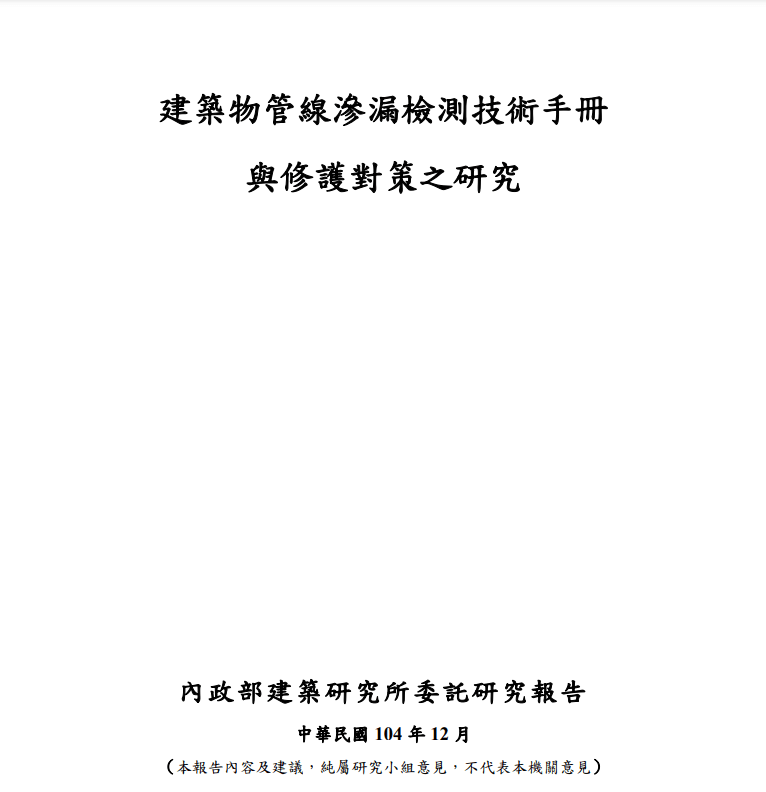 同年12月內政部建築研究所委託研究報告「建築物管線滲漏檢測技術手冊與修護對策之研究」
