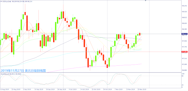 美元昨日受到众议院情报委员会将在感恩节后不久提交弹劾报告,早盘出现卖压震荡走跌,午后受到美国最高法院表示特朗普不用提供个人财务记录给众议院,美元一度出现买盘带动上涨,随后德国经济数据利好带动欧元上涨,也让美元出现卖盘急跌,随后美元处于震荡整理;晚间欧美买盘带动突破当日最高价格,也让美元再度出现卖盘跌破当日最低点,随后美联储官员讲到暂停降息,美元买盘带动突破当日最高价格,随后公布经济数据好坏参半造成美元大震荡,午夜过后美元出现获利卖盘,终场小跌做收。