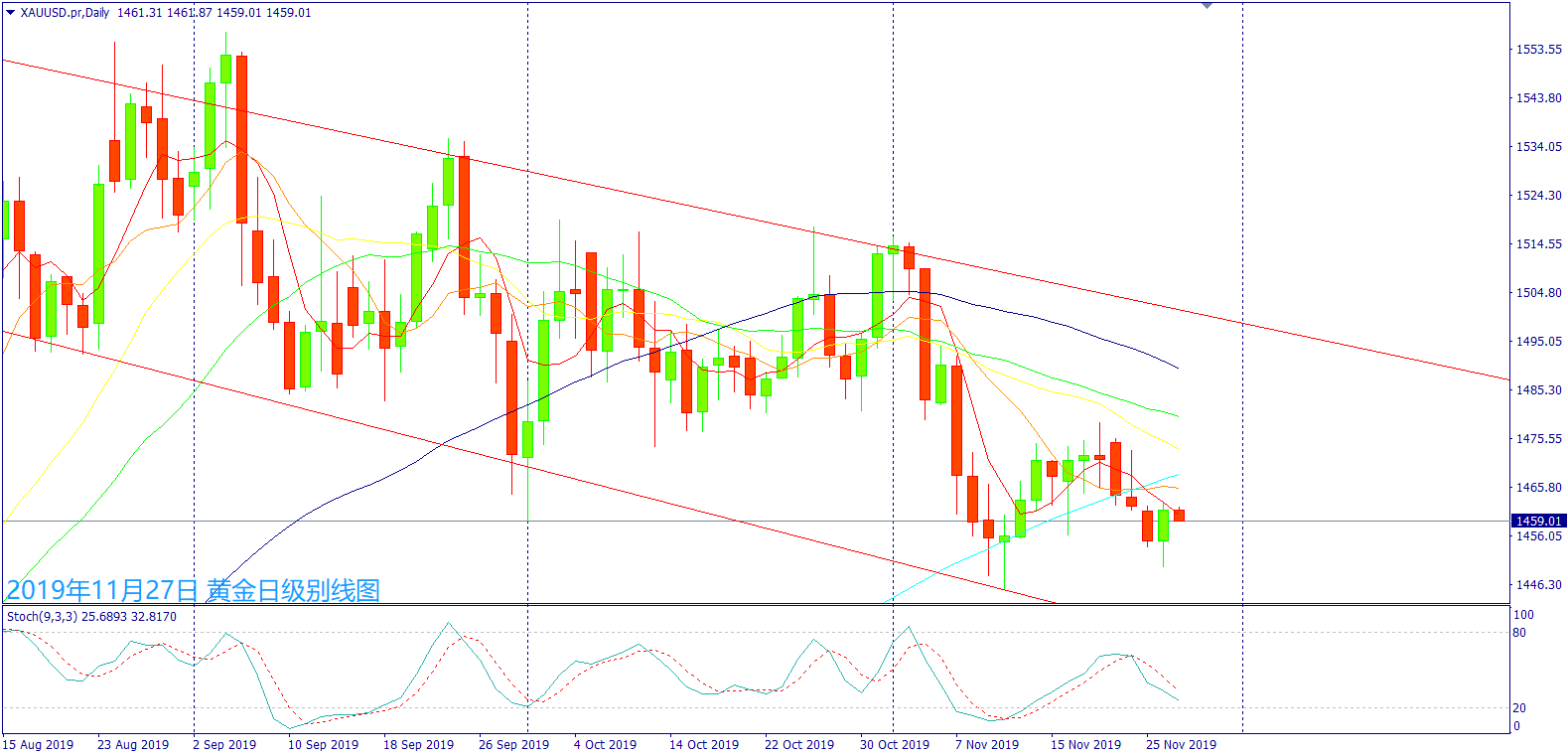 从日级别线图来看,一下影线阳烛盘中两度回踩1450关口,受到美国众议院将在感恩节后公布弹劾报告,造成避险资金回补黄金冲上1460美元,中长均线下行盖头压力,短线上方两大套牢压力1470~1480美元,可能造成黄金近期于1450~1470区间震荡整理。今日留意午后欧元买盘回补造成美元走跌,可能再度推升黄金急涨冲高,但留意4H级别上方套牢压力介于1463~1467美元,于晚间美国经济数据好坏参半,可能造成美元和美股出现反弹,将大机会再度让黄金出现大量卖单,一旦跌破1460关口可能出现急跌走势,直到午夜过后美元出现获利卖盘下跌,可能带动黄金回到1460关口附近震荡整理。