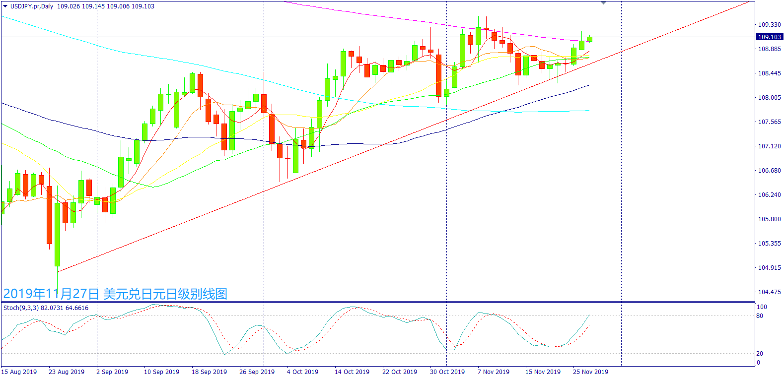 美元兑日元昨日受到美股电子盘上涨,早盘买盘带动急涨突破109日元,随后众议院情报委员会将在感恩节后不久提交弹劾报告,又让美股电子盘出现下行走势,也让避险资金回补造成日元上涨,美日因此出现震荡走跌,午后在美元和美股上涨下,带动美日出现反弹走势;晚间于109日元下方震荡整理,随后美元和美股处于震荡走势,受到投机资金买盘带动急涨冲高109.10日元,午夜过后美元和美股出现回调走势,也让美日出现卖盘震荡走跌,终场上涨做收。