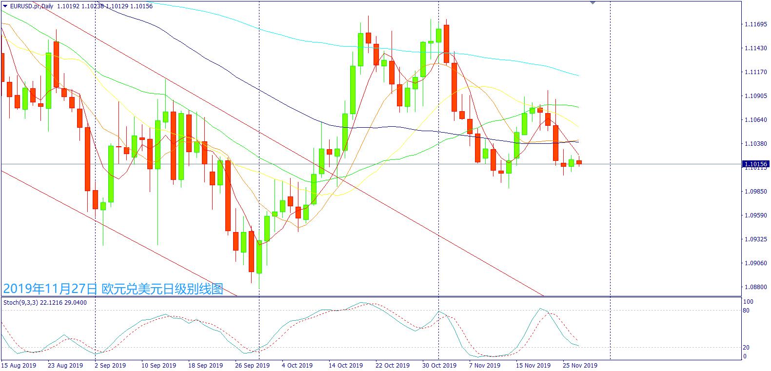 欧元兑美元昨日受到美国众议院情报委员会将在感恩节后不久提交弹劾报告,在美元出现回调下一度带动欧美上涨,午后受到美国最高法院表示特朗普不用提供个人财务记录给众议院,美元一度急涨也让欧美出现急跌走势,午后德国经济数据利好下,带动欧美出现震荡上涨走势;晚间美联储官员讲到暂停降息,美元出现急涨突破当日最高价格,也让欧美出现卖盘再度回踩1.1000关口,随后美国经济数据好坏参半让欧美震荡整理,午夜过后美元出现获利卖盘下行,再度带动欧美震荡走扬,终场上涨做收。