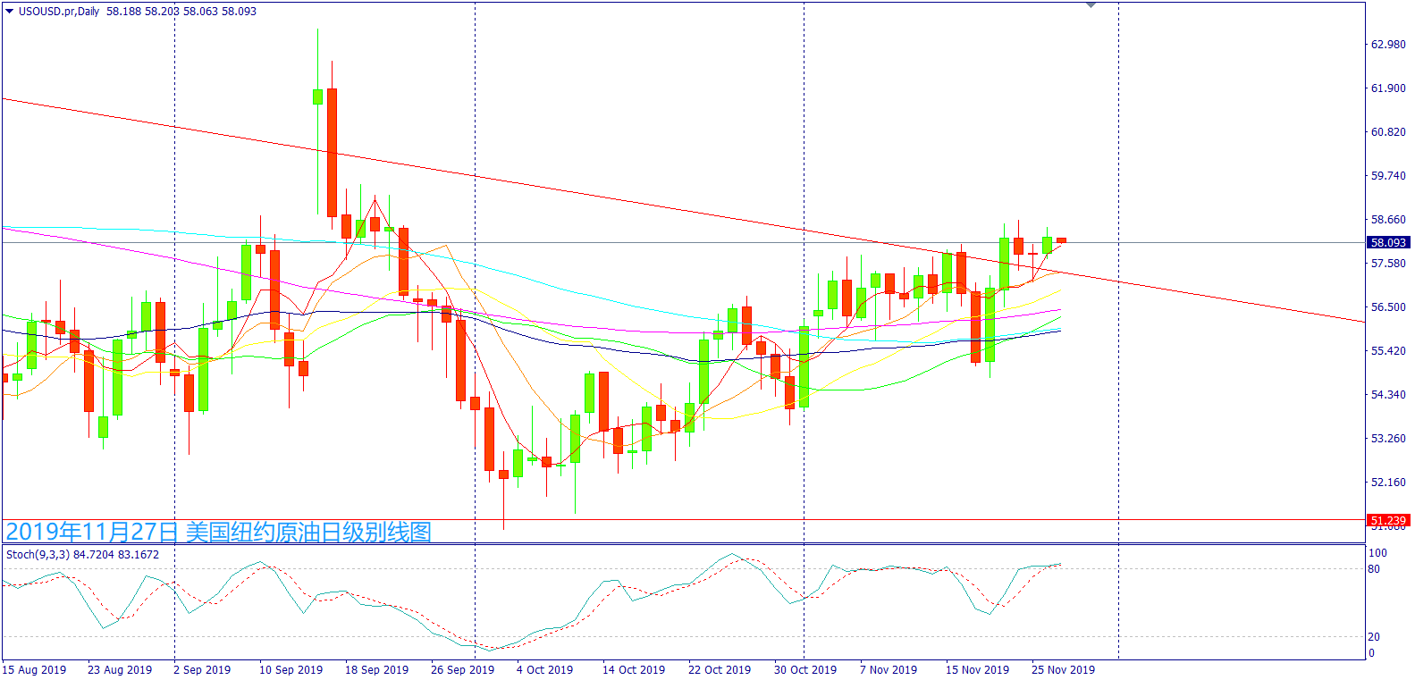 从日级别线图来看,一纺锤线阳烛盘中一度回踩5日均线,受到欧佩克减产消息带动油价再度急涨,短中均线处于上行,晚间油价没有跌破5日均线,可能再度挑战11月22日最高价位,不论是否突破前高皆可能出现获利卖盘造成下跌。今日留意欧盘股市震荡再度造成油价回踩5日均线,晚间美国经济数据好坏参半可能带动股市出现急涨,油价将大机会挑战11月高点走势,留意清晨API原油进口和库存皆增加,因此美国公布EIA库存后将大可能造成油价下跌,美国感恩节前夕周四清晨提前公布美国原油钻井数,如昨日美国EIA能源署将进行减产,将大可能对于油价获得支撑买盘,但需要留意股市如果出现获利卖盘走跌,将造成油价出现震荡走势。