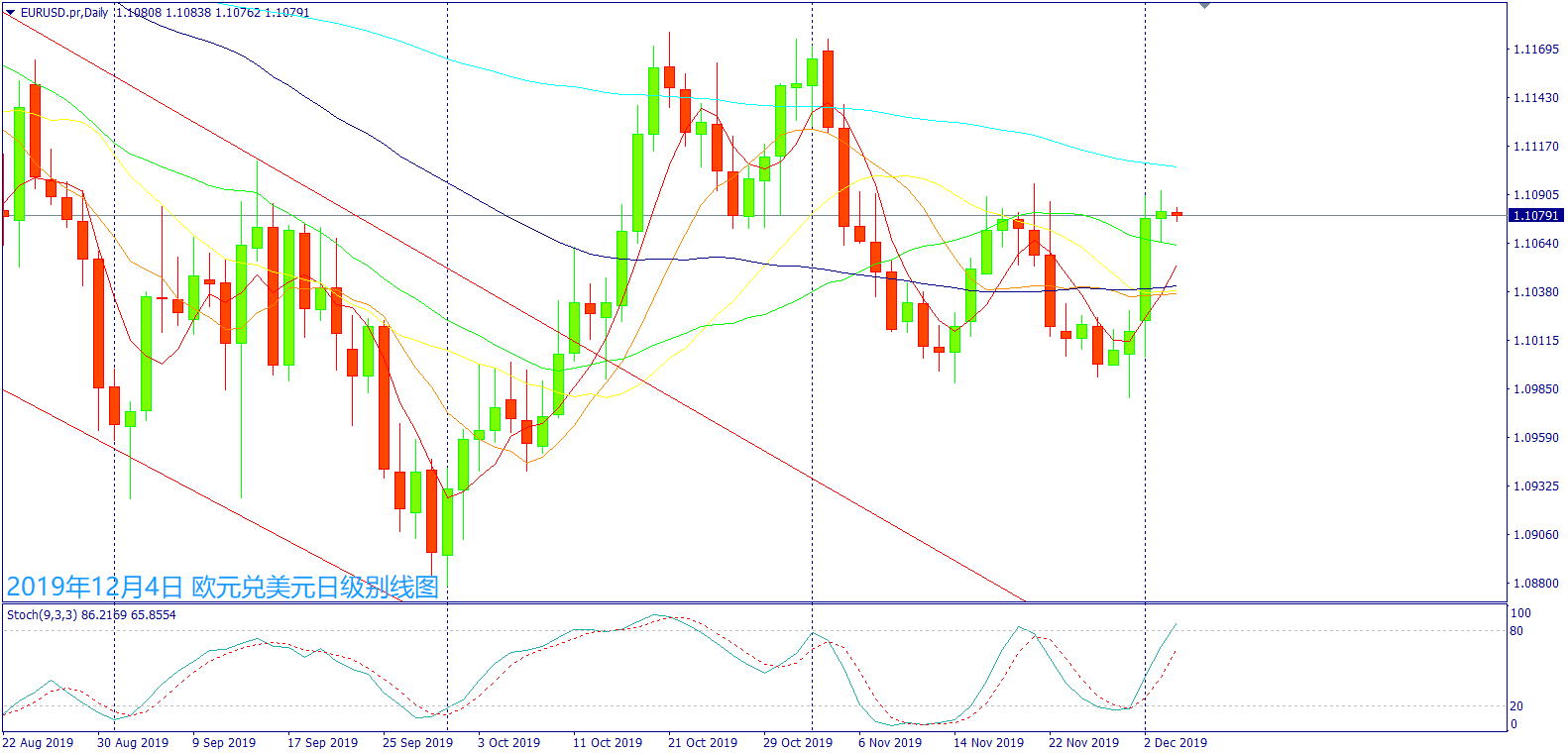 从日级别线图来看,一纺锤线阴烛早盘一度冲高5日均线受阻,受到贸易协议利淡造成美元和美股齐跌,也让美日跌破上升趋势线,短线来到11月中旬整理支撑价位附近,今日如果没有跌破60日均线可能出现反弹。今日午后如果欧元区经济数据利好下,在美元回调可能造成美日下跌回测60日均线支撑,而晚间美国经济数据好坏参半,关注美股出现止跌反弹走势,将大可能带动美日出现反弹走势,如果美日站回109日元价位上整理,代表多方趋势的回调整理,但3日内冲不上109日元将大机会转为空方走势。