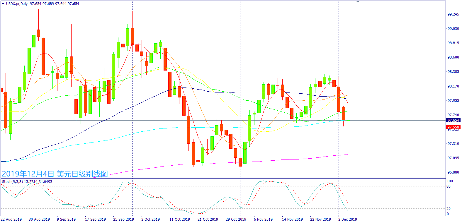 美元昨日早盘高开于30日均线上方整理,午后欧洲央行官员称采取其他货币政策也不轻易降息,欧元出现买盘震荡走扬,也让美元下行跌破前日最低价格,直到公布欧元区PPI指数后欧元遭抛售急跌,一度带动美元急涨;晚间于120日均线上方震荡整理,直到传出美国总统称贸易协定2020年总统大选后签署,美元再度出现卖盘跌破当日最低价格,午夜过后白宫对弹劾报告内容未展示有效证据,也让美元出现买盘站回120日均线,终场仍下跌做收。