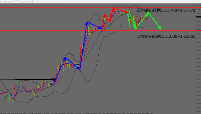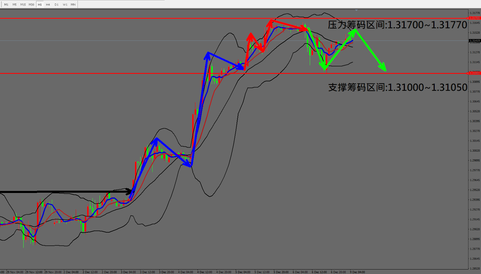 今日英镑/美元(12月9日) 早盘在1.31325附近,从技术分析面切入,1小时线级别观察走势符合上周五(6日)预测斜度越走越陡,加上涨多无力推升,使得英镑出现拉回行情,目前高点震荡区间,因此有机会涨至上方压力再度下跌。