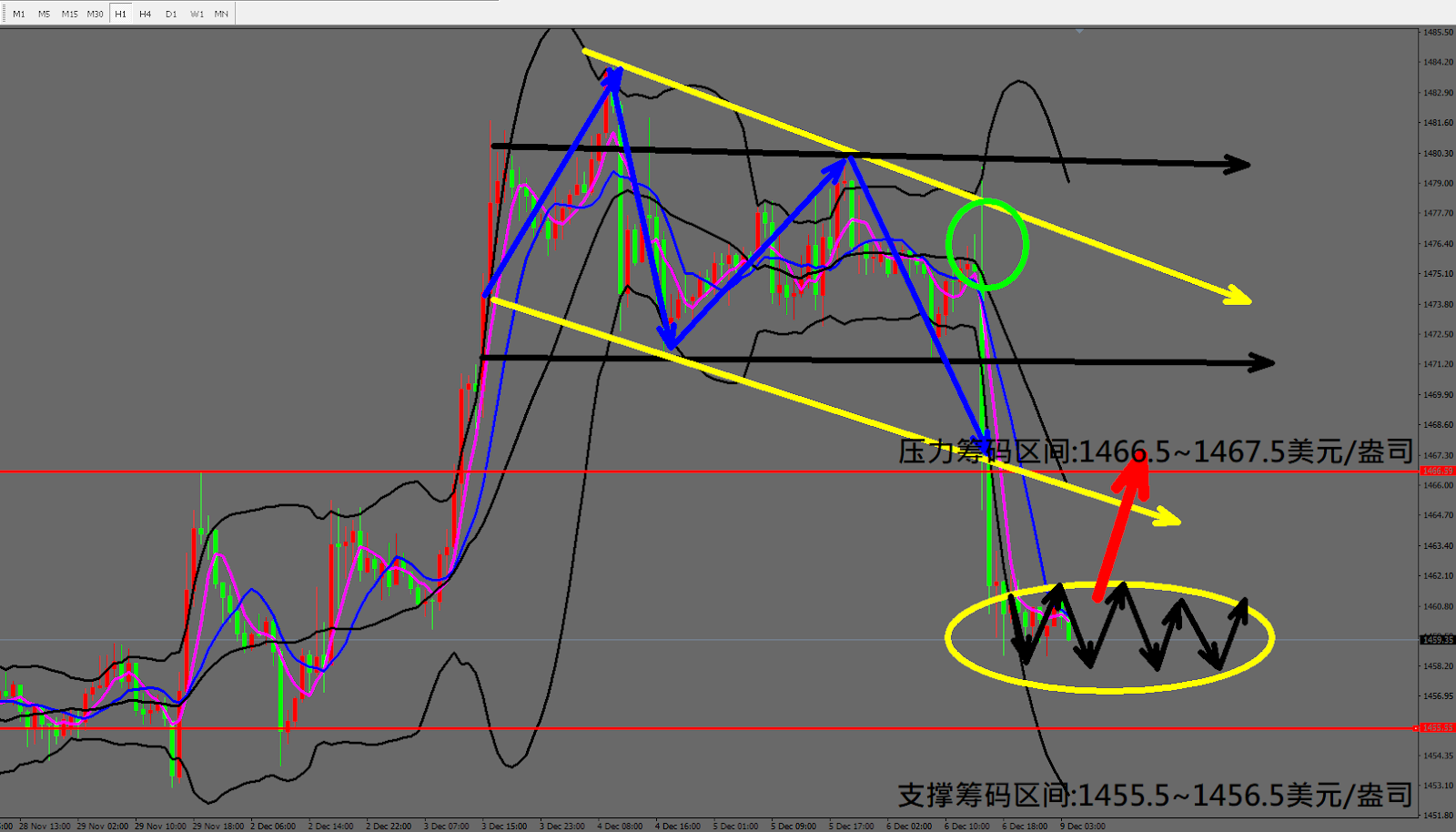 今日黄金(12月9日) 早盘在1459.5美元/盎司附近,从技术分析面切入1小时级别观察走势符合上周五(6日)预测架构冲高至绿色圈后随即大跌,受到大非农数据优于市场预期,使得黄金大跌,一度跌破1460美元/盎司,目前低点止稳区间震荡,因此有机会锁定筹码后出现反弹行情。