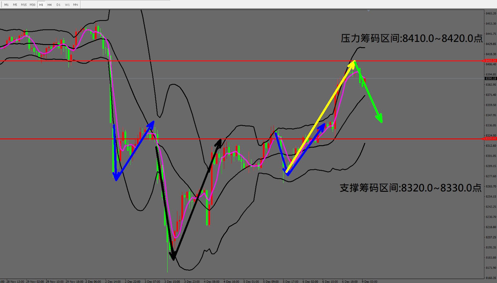 今日纳指(12月9日) 早盘在8401.5附近,从技术分析面切入,1小时线级别观察走势按照上周五(6日)预测站稳短线支撑持续上涨,目前冲高后出现大黑K棒,因此有机会持续拉回至布林通道中轨下方。