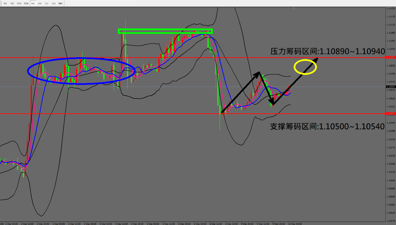 今日欧元/美元(12月10日) 早盘在1.10642附近,从技术分析面切入,1小时级别观察走势符合昨日(9日)预测出现小幅反弹,目前拉回后再度上涨,从图中架构有左肩与头部,因此有机会反弹至黄金形成右肩型态。