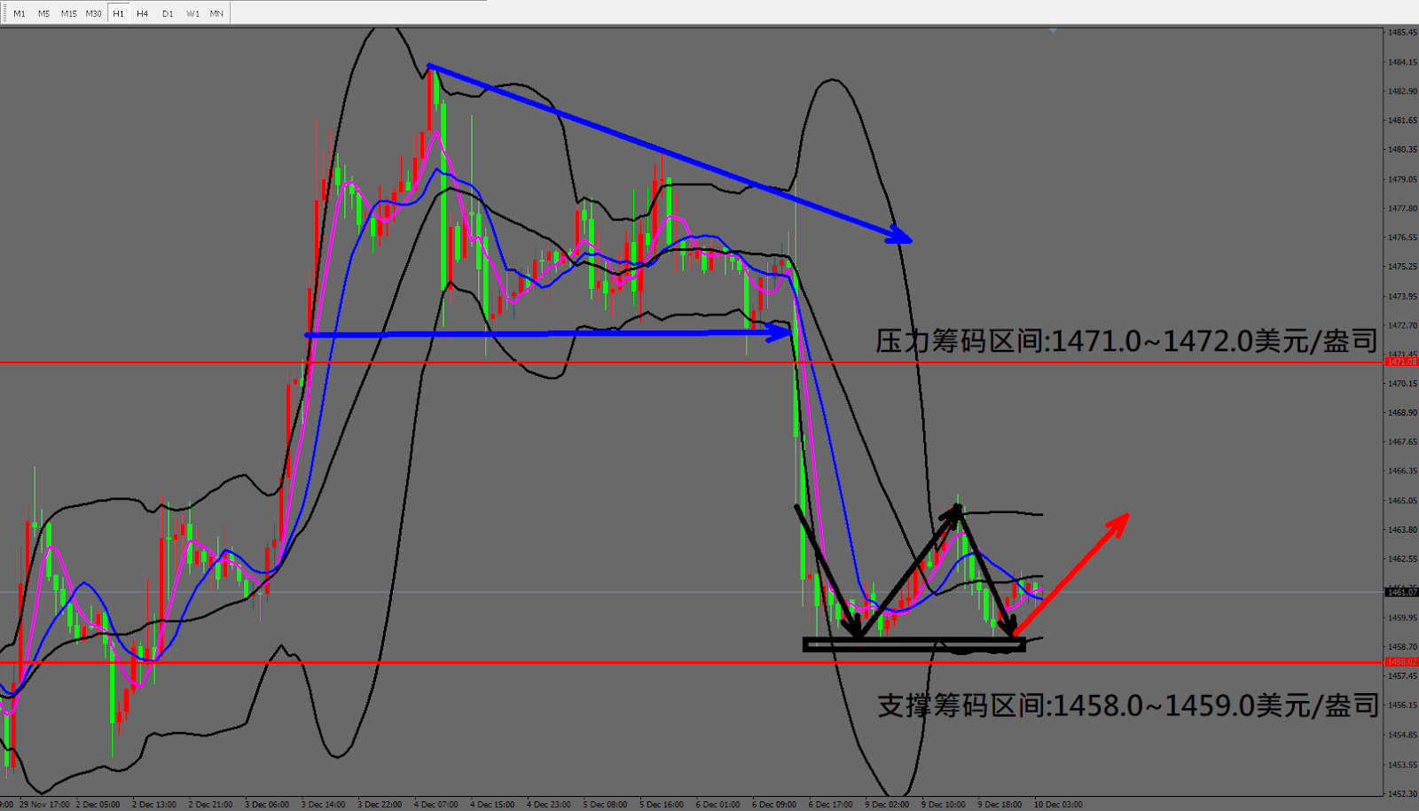 今日黄金(12月10日) 早盘在1461.6美元/盎司附近,从技术分析面切入1小时级别观察走势符合昨日(9日)预测架构底部出现反弹行情,目前拉回整理测试短线支撑,因此有机会锁定筹码后再度上涨。