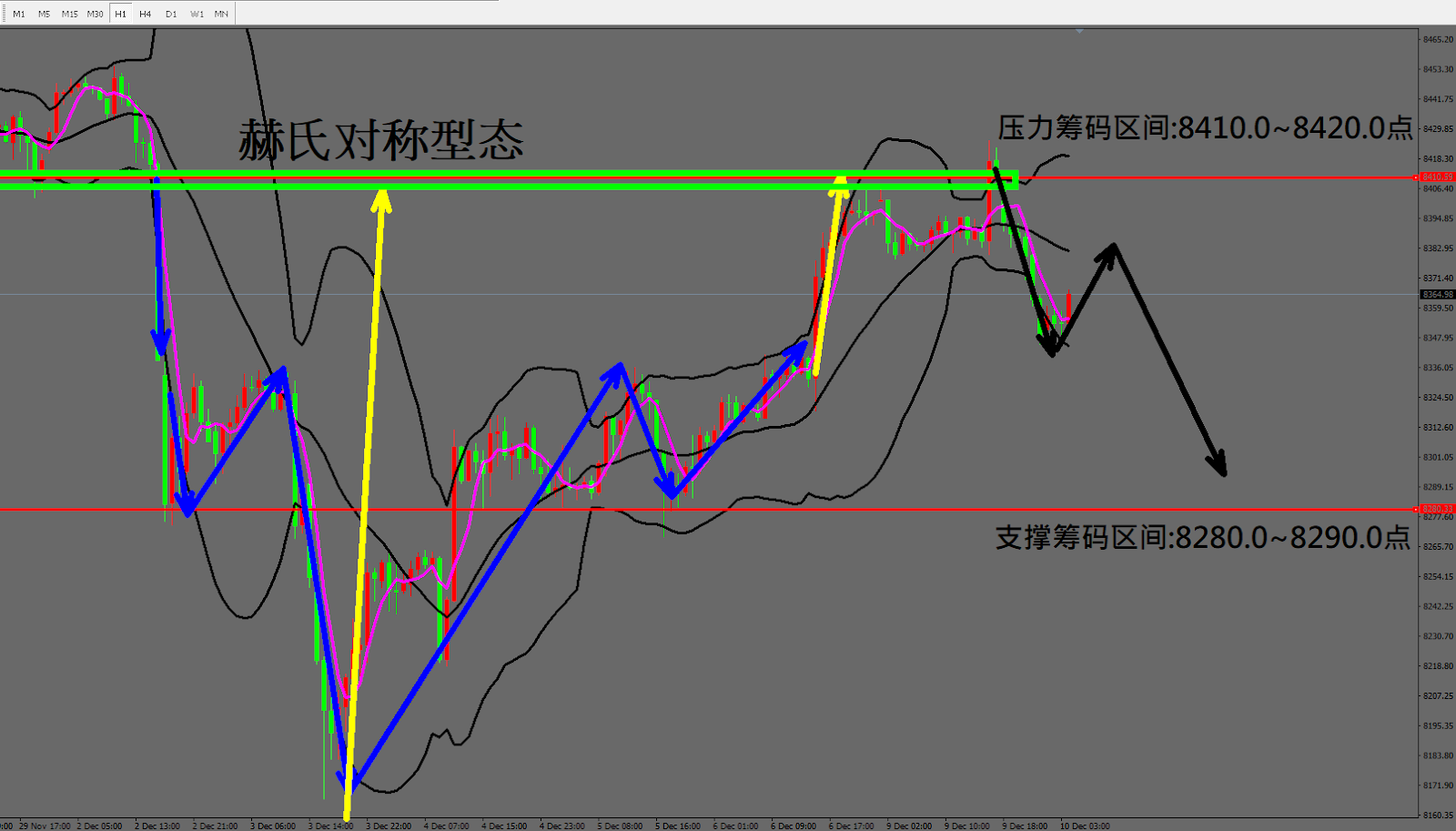 今日纳指(12月10日) 早盘在8350.9附近,从技术分析面切入,1小时线级别观察走势符合昨日(9日)预测晚间做拉回行情,目前确定高点冲高失败,因此有机会白天先做反弹至布林通道中轨后再度下跌。